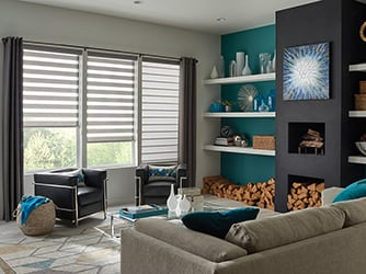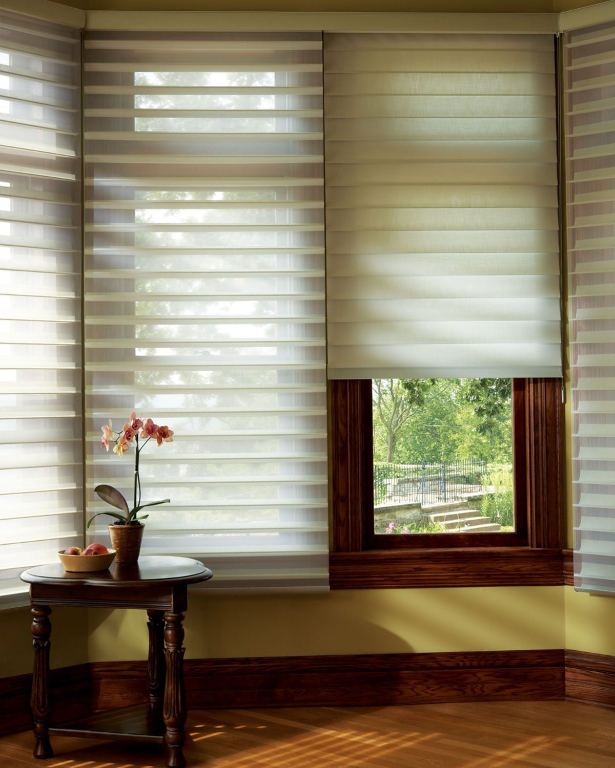 The dual layers of solid and sheer horizontal vanes continually cross over each other as the shade is raised or lowered, allowing users to control the amount of incoming light and the view-through effect with the shade partially raised at various points throughout the window.